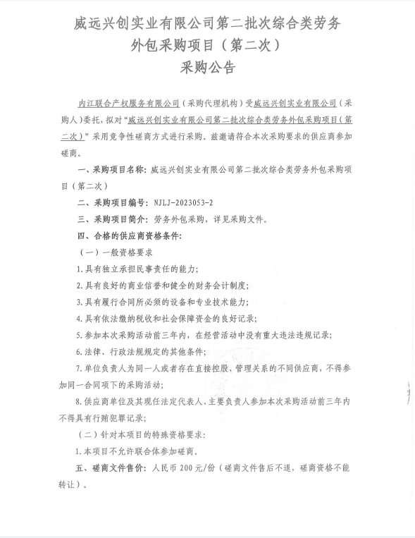 威遠(yuǎn)興創(chuàng)實(shí)業(yè)有限公司第二批次綜合類勞務(wù)外包采購項(xiàng)目(第二次)采購公告