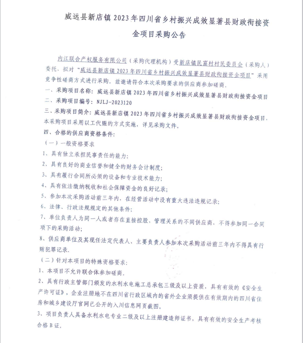 威遠(yuǎn)縣新店鎮(zhèn)2023年四川省鄉(xiāng)村振興成效顯著縣財(cái)政銜接資金項(xiàng)目采購(gòu)公告