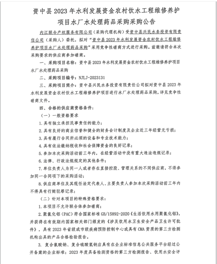 資中縣2023年水利發(fā)展資金農(nóng)村飲水工程維修養(yǎng)護(hù)項(xiàng)目水廠水處理藥品采購(gòu)采購(gòu)公告