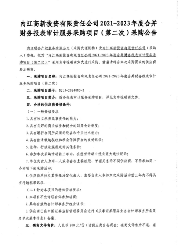 內(nèi)江高新投資有限責(zé)任公司2021-2023年度合并財務(wù)報表審計服務(wù)采購項目(第二次)采購公告