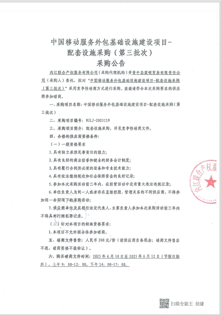 中國(guó)移動(dòng)服務(wù)外包基礎(chǔ)設(shè)施建設(shè)項(xiàng)目-配套設(shè)施采購(gòu)(第三批次)采購(gòu)公告