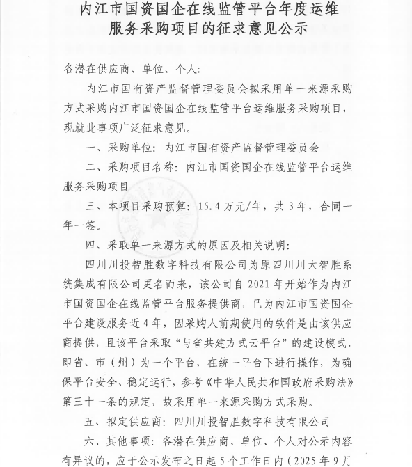內江市國資國企在線監(jiān)管平臺運維服務采購項目的征求意見公示