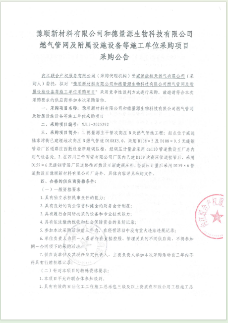 豫順新材料有限公司和德量源生物科技有限公司燃氣管網(wǎng)及附屬設(shè)施設(shè)備等施工單位采購項目采購公告
