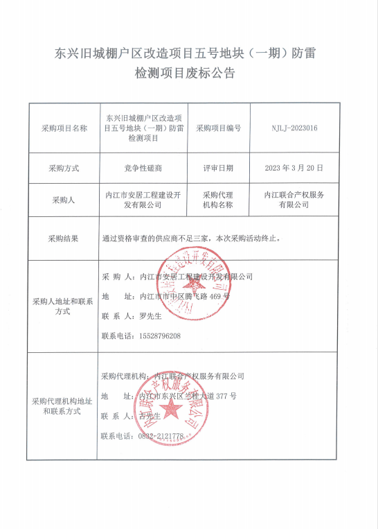 東興舊城棚戶區(qū)改造項目五號地塊(一期)防雷檢測項目廢標(biāo)公告