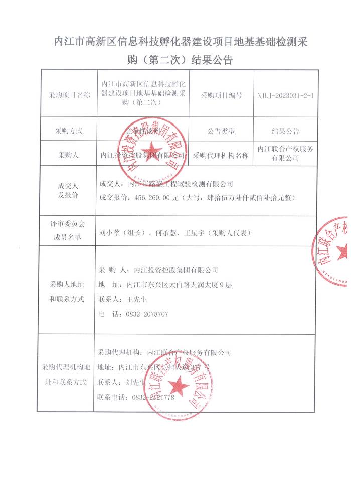 內(nèi)江市高新區(qū)信息科技孵化器建設(shè)項(xiàng)目地基基礎(chǔ)檢測(cè)采購(gòu)(第二次)結(jié)果公告