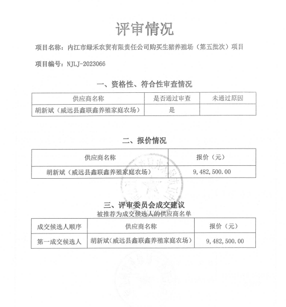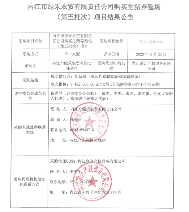 內(nèi)江市綠禾農(nóng)貿(mào)有限責(zé)任公司購買生豬養(yǎng)殖場(chǎng)(第五批次)項(xiàng)目結(jié)果公告