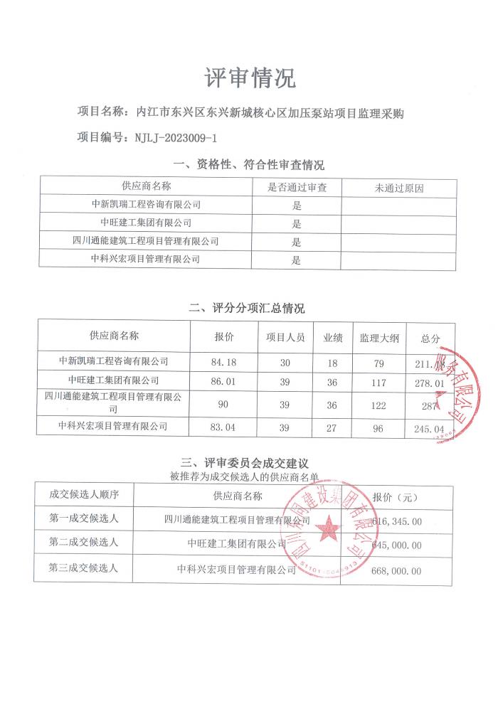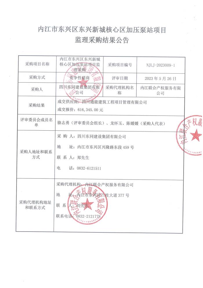 內(nèi)江市東興區(qū)東興新城核心區(qū)加壓泵站項目監(jiān)理采購結(jié)果公告