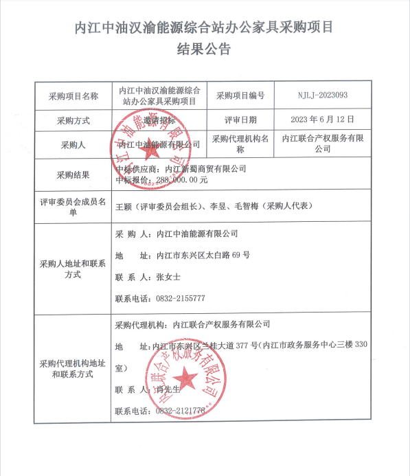 內(nèi)江中油漢渝能源綜合站辦公家具采購(gòu)項(xiàng)目結(jié)果公告