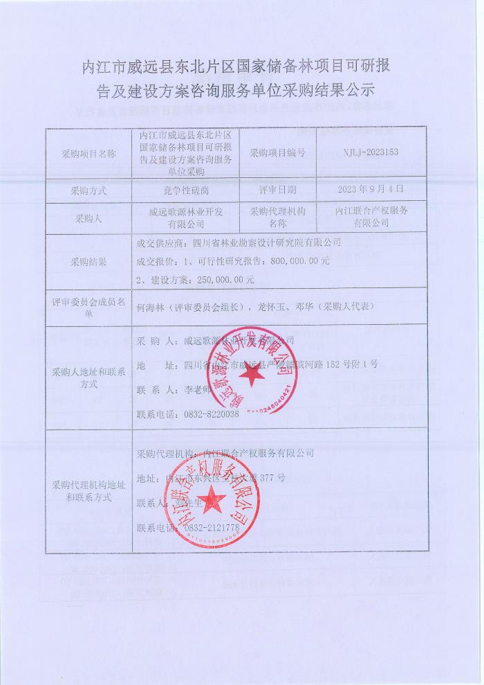內(nèi)江市威遠(yuǎn)縣東北片區(qū)國(guó)家儲(chǔ)備林項(xiàng)目可研報(bào)告及建設(shè)方案咨詢服務(wù)單位采購(gòu)結(jié)果公示
