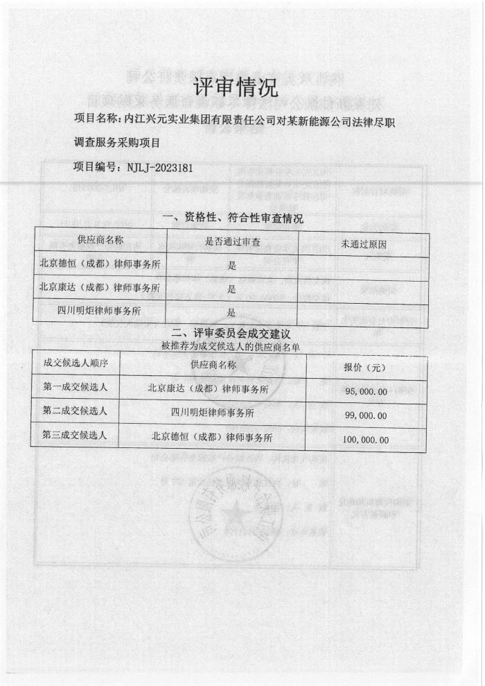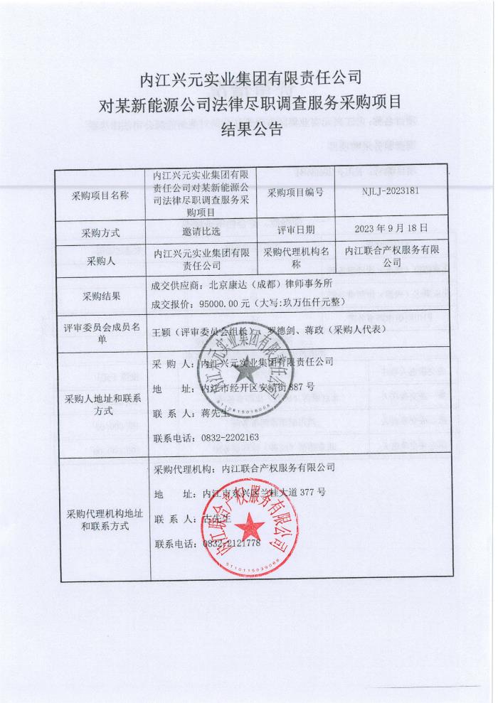 內(nèi)江興元實(shí)業(yè)集團(tuán)有限責(zé)任公司對(duì)某新能源公司法律盡職調(diào)查服務(wù)采購項(xiàng)目結(jié)果公告