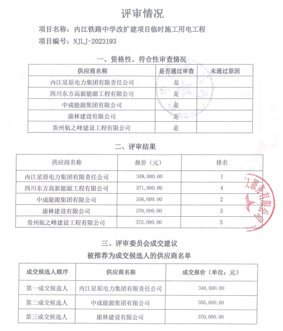 內江鐵路中學改擴建項目臨時施工用電工程結果公告