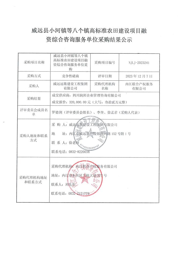 威遠縣小河鎮(zhèn)等八個鎮(zhèn)高標(biāo)準(zhǔn)農(nóng)田建設(shè)項目融資綜合咨詢服務(wù)單位采購結(jié)果公示