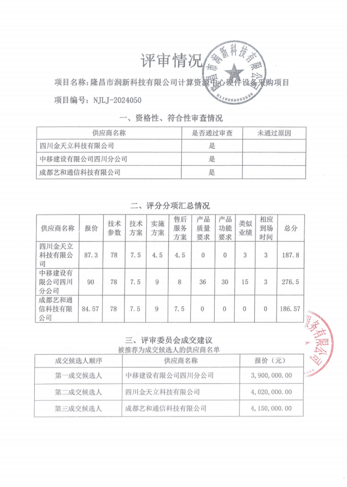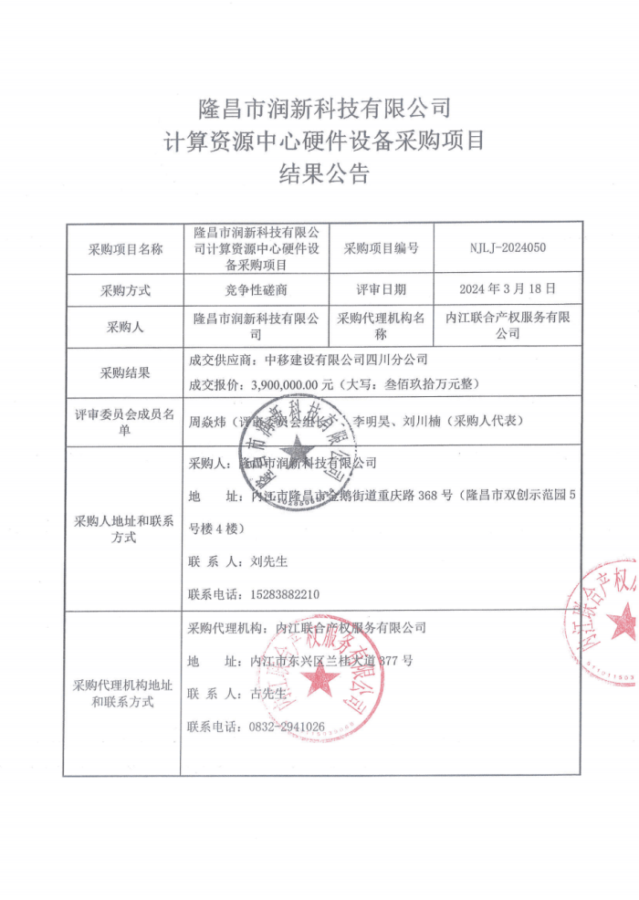隆昌市潤新科技有限公司計算資源中心硬件設備采購項目結果公告
