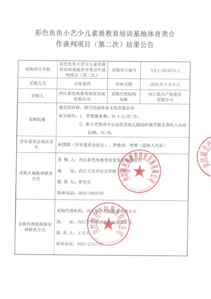 彩色魚魚小藝少兒素質(zhì)教育培訓(xùn)基地體育類合作談判項(xiàng)目(第二次)結(jié)果公告
