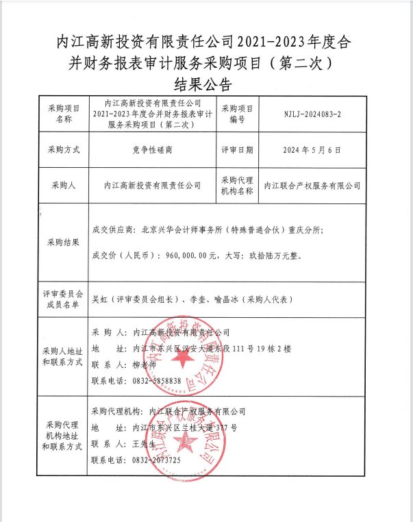 內(nèi)江高新投資有限責(zé)任公司2021-2023年度合并財務(wù)報表審計服務(wù)采購項目(第二次)結(jié)果公告