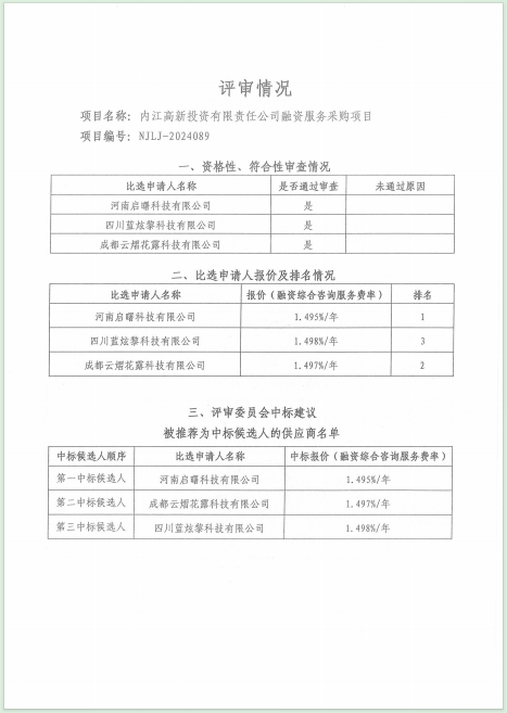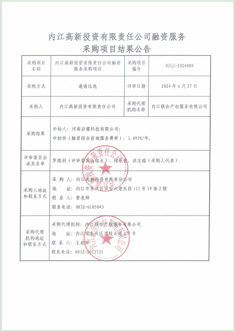 內江高新投資有限責任公司融資服務采購項目結果公告