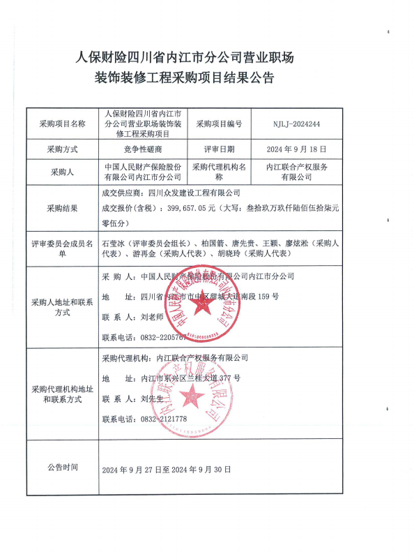 人保財(cái)險(xiǎn)四川省內(nèi)江市分公司營業(yè)職場裝飾裝修工程采購項(xiàng)目結(jié)果公告