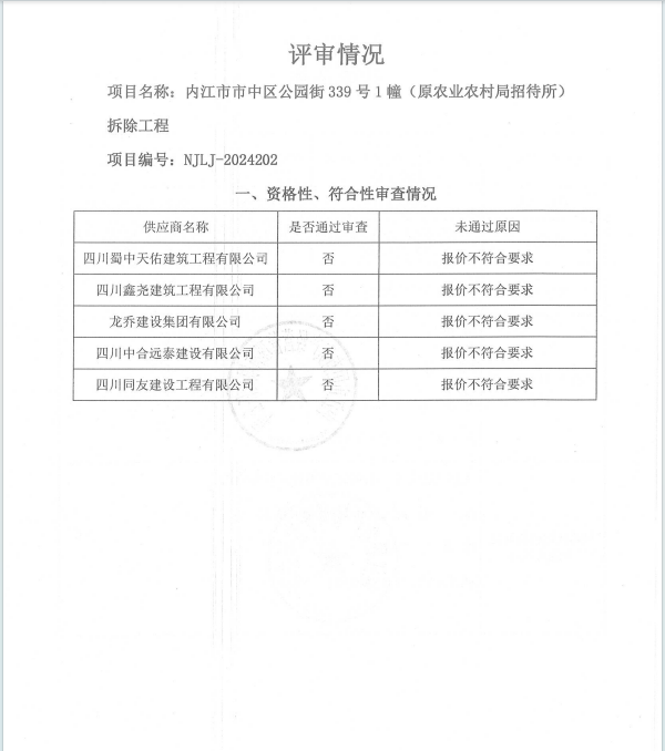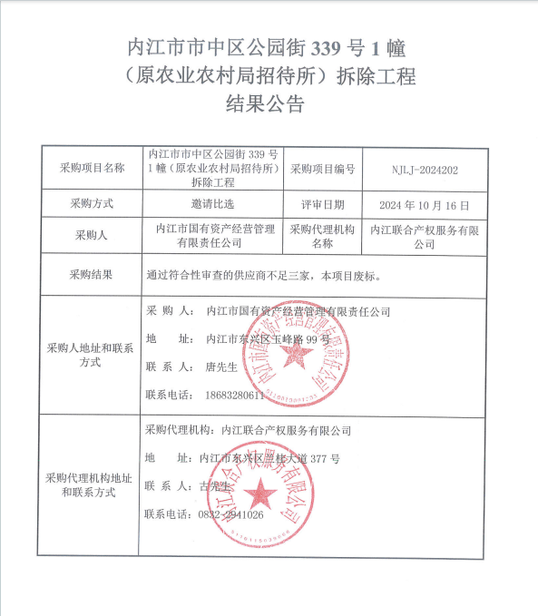 內(nèi)江市市中區(qū)公園街339號(hào)1幢(原農(nóng)業(yè)農(nóng)村局招待所)拆除工程結(jié)果公告