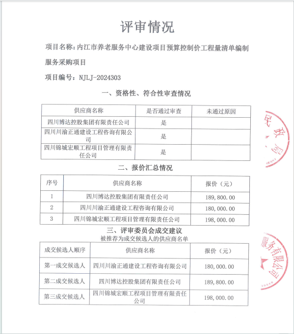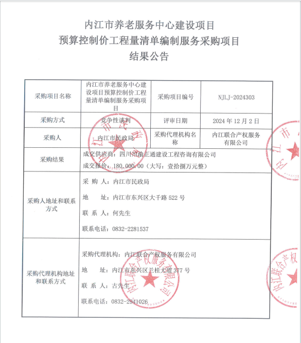 內(nèi)江市養(yǎng)老服務(wù)中心建設(shè)項(xiàng)目預(yù)算控制價(jià)工程量清單編制服務(wù)采購(gòu)項(xiàng)目結(jié)果公告