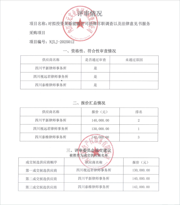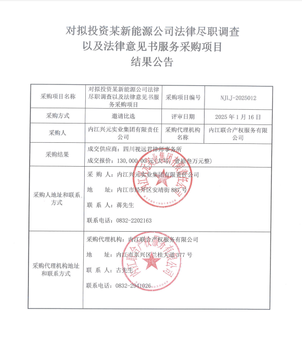 對擬投資某新能源公司法律盡職調查以及法律意見書服務采購項目結果公告