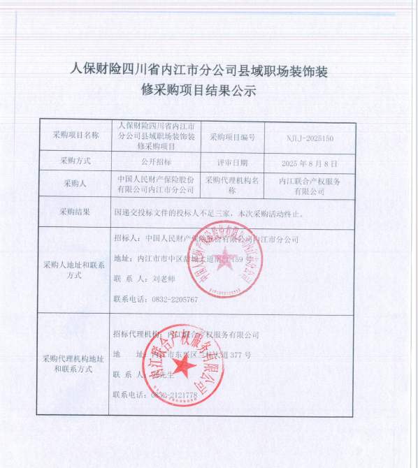 人保財險四川省內(nèi)江市分公司縣域職場裝飾裝修采購項目結(jié)果公示