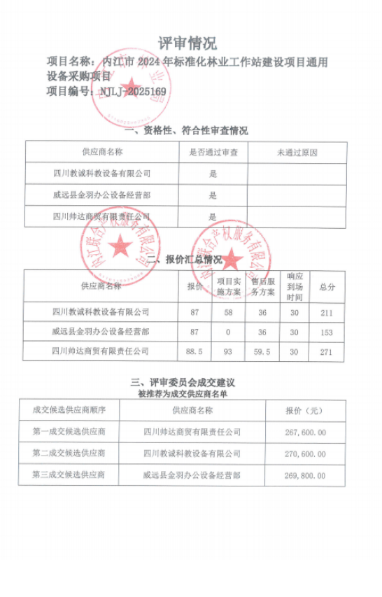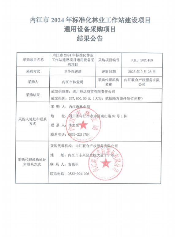 內(nèi)江市2024年標準化林業(yè)工作站建設(shè)項目通用設(shè)備采購項目結(jié)果公告