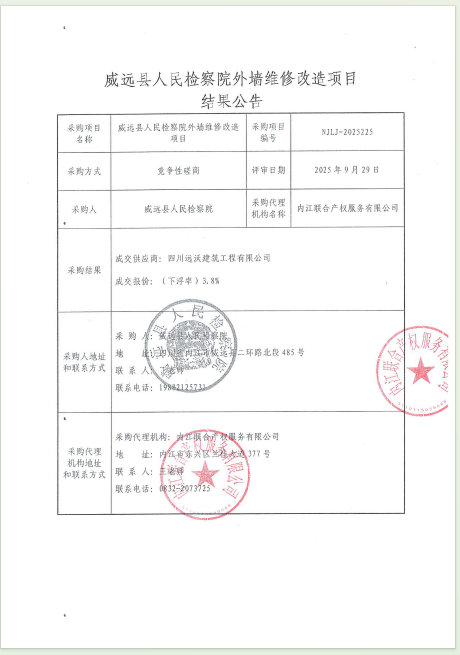 威遠(yuǎn)縣人民檢察院外墻維修改造項目結(jié)果公告
